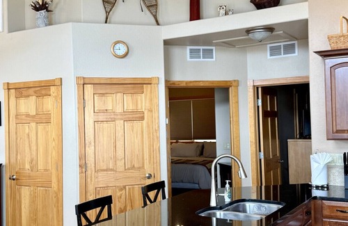 You’ll love the soaring ceilings, abundant natural light, and thoughtful design throughout. The living area features a smart TV, fireplace, and seating for five. Both bedrooms are master suites with luxurious king and queen beds and full private bathrooms—one with a jetted tub and double sinks, the other with a large walk in shower. Additional sleeping arrangements include a living room sofa that has a queen sized pull-out mattress, accommodating up to 6 guests max.