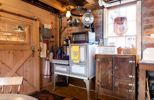 There is a 'mini kitchen' in this cabin and not a full size oven. You are provided a medium sized toaster convection oven (cooks a small chicken!), a 2 burner hot plate, a griddle plate, toaster, coffee maker, tea kettle, fondue pot (bring the cheese and wine!), vintage fridge with small freezer. It's everything you need for a weekend's or week's stay...