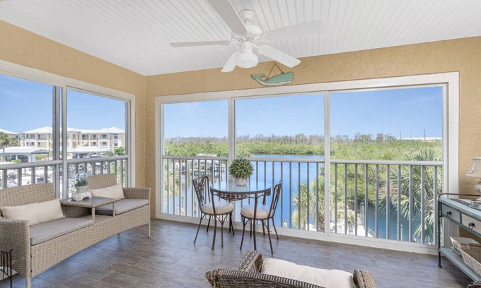 Coastal charm and sunset views await at this 2BR/2BA waterfront condo on Oyster Creek. This bright, second-floor end unit features large windows, an enclosed lanai, and elevator access. Enjoy direct Gulf access via Stump Pass, community docks, a kayak launch, heated pool, and grilling area. Includes A/C, washer/dryer, dishwasher, WiFi, Smart TV, and coffeemaker. Condo approval required; fees apply. Pets considered with owner approval. No smoking.