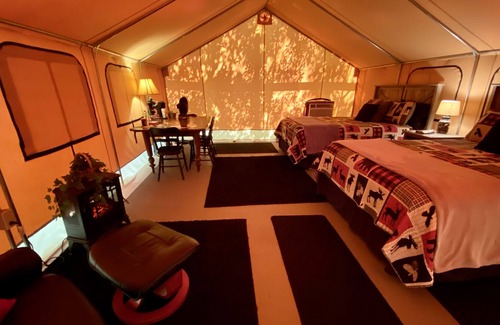 A unique tent experience in the heart of the Ozark National Forest. Our 20 x 16 canvas wall tents have 2 queen beds and are heated and cooled. Each site has a firepit and charcoal grill and we have a 2 bath, bathhouse. Our location offers convenient access to hiking, fishing, atv riding, rivers or just star gazing. Join us for an amazing outdoor experience and let the hassle of setting up a tent be ours. Big and little kids welcome.