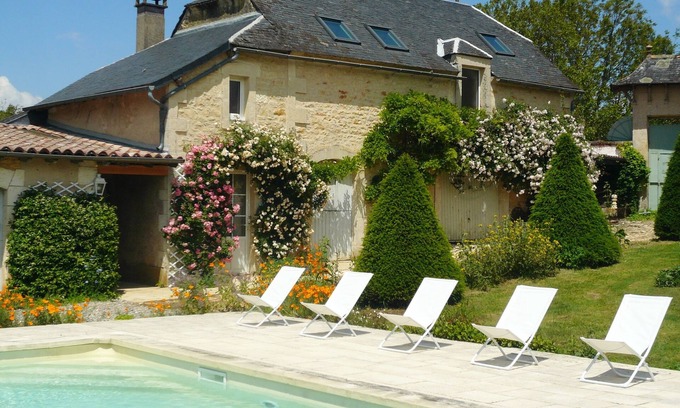 In the heart of Périgord Noir, ideally located for all the holiday activities (important places of interest, sport activities), this house welcomes you (4 to 8 people) in a fenced park with trees and flowers (beautiful rose bushes collection), equipped with a heated pool. It also boasts a 45 sq.m exposed stone and beams living room with fireplace, an open-plan equipped kitchen (oven, microwave, dishwasher, washing machine, and tumble dryer), a TV, a barbecue, 4 bedrooms, of which one is on the ground floor (with two 80 cm beds), and the three other one with exposed beams are upstairs (one 140 cm bed, one 160 cm bed, and two 80 cm beds), 4 shower rooms of which 3 have hydromassage showers, and 4 WCs.