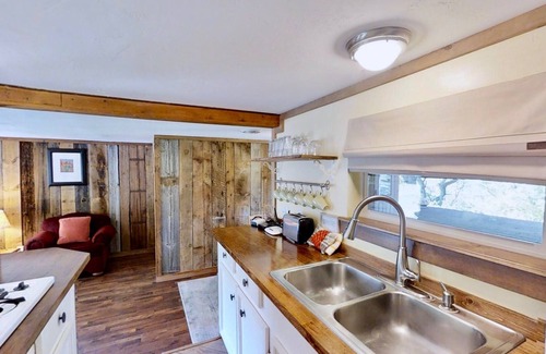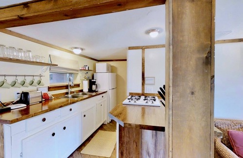 The homey living room has a large coffee table, 2 overstuffed easy chairs, and queen-size sofa sleeper. The dining alcove provides eclectic ambiance with barn wood walls, seating for four at the drop-leaf table, and lighting via a Tiffany stained glass hanging lamp. A snack bar with two stools provides additional dining space. The rustic base cabinets of the step-up, galley-type kitchen are washed in a refreshing lake-blue shade, and topped with a unique bamboo countertop. Meal preparation is a breeze with a 4-burner stovetop, large toaster oven, and microwave oven. A double sink and medium-size refrigerator/freezer complete the kitchen, which is fully equipped with dishes and cookware. This rustic cabin does not have TV and cell service may be limited.