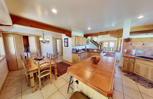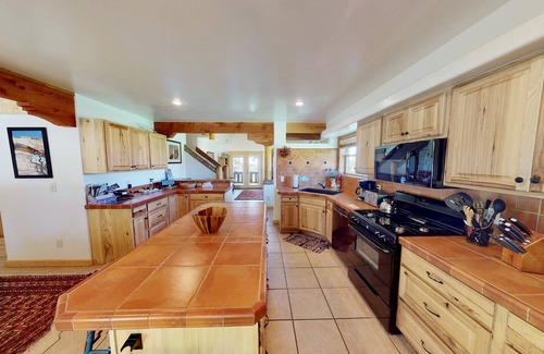 The main floor has three bedrooms, one with a king bed and a master bathroom, one with a queen bed and one with two twin sized beds. A second bathroom is located in the hall. The rest of the main floor includes a large open kitchen with an island and breakfast bar, a dining area, and a cozy living room with a wood burning stove. Upstairs, the loft provides a delightful place for gathering and sharing stories of your Moab adventures. This comfortable sitting area has access to TV with Netflix/Blue Ray and more spectacular views. Two twin beds and a sleeping sofa are located in the loft. A spacious balcony provides wide open views of the La Sal mountains and a perfect opportunity for a spontaneous shuffleboard game. This cabin can accommodate up to eight guests yet still very cozy for couples or small families.