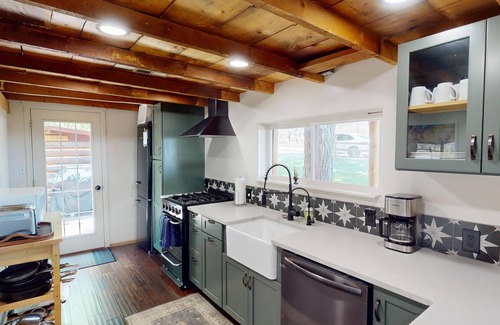 The Pack Creek Road House is one of the most beautifully redone cabins that Moab has to offer. Located in Pack Creek, about 20 minutes from downtown Moab, you’ll feel refreshed from the mountain air at the base of the La Sal mountains. This 2 bedroom 2 bath cabin has views of the mountains in nearly every room thanks to the big windows. *Please note that due to safety concerns the fireplace is not available for guest use. There is a great standing fire pit on the back patio for guest use.