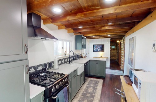The dining area and living room are combined. You’ll want to sit all day looking at your views and admiring the intricacies this home has to offer, like the beautiful wood ceiling, furniture, and so much more. If you want to connect back to the world, then you will be happy to have a Smart TV and wifi. Cell reception is a little dodgy out at Pack Creek.