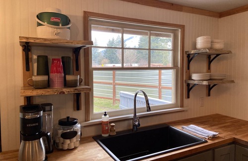 Our fully renovated rustic 1948 Base Camp is located in Packwood WA. We're walking distance to the Packwood Brewery, local restaurants, and grocery store. Our cabin is located in town, just 10 minutes from the Gifford Pinchot National forest, and only 11.9 miles from the Ohanapecosh campground. Google Maps shows Packwood as 2.5 hours from Portland or Seattle, and only 20 minutes from White Pass Skiing. Enjoy your next trip to Mt Rainier or the White Pass ski resort while staying at Base Camp. Enjoy all the conveniences of being within walking distance to local entertainment and dining, but stay within 20 minutes of skiing and hiking trails. Our fully renovated cabin is located in downtown Packwood Wa. This 1244 square foot home features a 2bd/2bth, spacious living room, beautiful kitchen, and large outdoor fire pit. Our entire cabin has been fully remodeled, featuring a complete kitchen, new LG appliances, Frigidaire induction oven, Kohler plumbing throughout, Mohawk plank flooring, and outdoor fire pit with lighting above. The master bedroom has its own 3/4 en-suite bath, and select number king bed. The master also features french doors leading out back to the deck and secluded fire pit. Our second bedroom has its own 3/4 en-suite bath, queen Casper bed, and twin over full bunk beds. The spacious living room features reclaimed wood walls, a 55” TCL mounted flatscreen with Hulu+. We offer a fully stocked kitchen with anything you’d need for cooking or baking. Our laundry room (off the kitchen) comes equipped with a new full size LG washer and dryer set, bench for unloading bags and gear, cubbies, and small food pantry. Daikin split ductless ac units located in living room, kitchen and both bedrooms.
