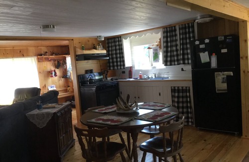 Our simple dwelling is well equipped with a queen bed, a bunk bed (single bed on top, full size bed on bottom.), and a well appointed bath room. A dishwasher, washer/dryer, and air conditioning are also included. The interior was completely remodeled, and insulated in 2017 for year round use. The rooms are covered in native white pine sawed on our own sawmill. Right outside you will find a 10x20 deck equipped with its own gas grill. Of course there is a fire pit with firewood provided. Campfire tales, s'mores, and hot dogs for roasting are on you. The White Elephant country store and restaurant is a local business right down the road. We recommend the bacon chicken wrap, or the prime rib which is a special on Friday and Saturday nights.