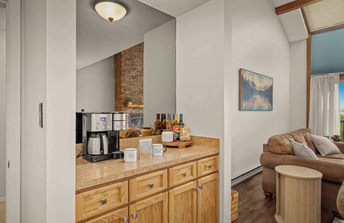 Tucked just off the kitchen is a charming coffee nook with a K-Cup and drip coffee maker, mugs, and extras to start your morning with ease.
