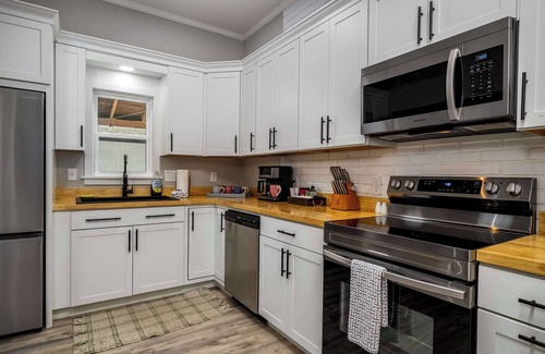 The kitchen is fully stocked and ready for all your cooking needs! With modern appliances, dual Keurig/drip coffee maker, dishwasher, stove/oven, microwave, toaster, cookware, and a dining table, preparing meals is a breeze. There’s also a charcoal grill for outdoor cooking!