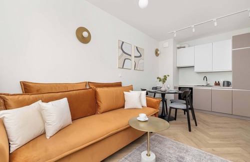 This tastefully furnished apartment with an area of 30.5 m² offers a comfortable stay for 4 people, making it an ideal retreat for a family or a group of friends. The harmony of white and soft, muted colors gives the interior a modern look, while the carefully chosen details add coziness and warmth, creating a homely atmosphere. The layout includes a living room with a kitchenette, a bedroom, a bathroom with a shower, and a balcony. The living room is the perfect space for relaxation and spending time with loved ones – the soft, fold-out sofa with a sleeping function for two people invites you to rest, and the balcony provides the opportunity to enjoy a morning coffee outdoors. The living room also has air conditioning, which ensures a pleasant temperature on hot days. The kitchenette blends seamlessly with the interior decor and is equipped with high-quality appliances, such as an oven, induction cooktop, and dishwasher, encouraging culinary experiments. The spacious bedroom with a comfortable double bed and a large wardrobe is perfect for storing clothes and luggage. The stylish bathroom, decorated in navy blue with elegant golden accents, offers not only a shower but also a hairdryer and a washing machine, which enhance the comfort of the stay. Evening entertainment is provided by a Smart TV with cable television and free Wi-Fi access. To start the stay, guests receive a set of toiletries, towels, and bed linen. An additional advantage of the apartment is the assigned parking space, which increases the convenience of the stay. This is the perfect place for those who appreciate modern style and comfort in a warm, cozy atmosphere.