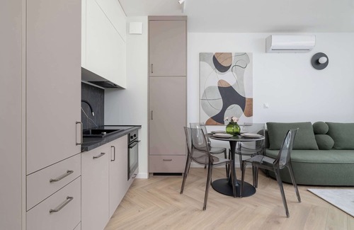 This elegant and stylish apartment with air-conditioned living room is designed for three people. The interior design is bright and functional, making it an ideal place to relax for parents traveling with children or couples looking for an intimate atmosphere. The arrangement is dominated by beige, wood and white. Guests can relax outdoors while drinking their morning coffee and enjoying the view of the neighborhood on the furnished balcony with a table and two chairs. Motorized travelers can take advantage of a parking space located in the garage hall. The living room is furnished with a comfortable double sofa in a refined olive shade, as well as a modern transparent table for working remotely during business trips. The room is also equipped with a television with access to cable channels, so you can relax in the evenings with your favorite programs. The space also has a cabinet for handy trinkets and a dining table with chairs. Dishes and snacks can be prepared in the practically furnished kitchenette. Such appliances as a refrigerator, transfer coffee machine, kettle, induction hob and oven are available here. In the bedroom stands a double bed and a capacious closet, and a mirror hangs on the wall. The bathroom offers a washing machine, shower, hair dryer, and a welcome towel set. This is a great place for a short or long-term stay.