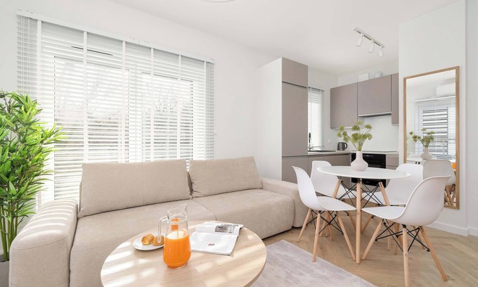 This tastefully designed apartment, measuring 33.49 m², ensures a comfortable stay for up to 4 guests, making it an ideal retreat for families or groups of friends. The elegant harmony of white and beige tones lends the interiors a modern character, while carefully selected accessories create a warm, homely atmosphere. The layout includes a living room with a kitchenette, a bedroom, a bathroom with a shower, and a balcony. The living room offers the perfect space to relax and spend time with loved ones – a soft, fold-out sofa with a sleeping function for two invites relaxation, and the balcony provides an opportunity to enjoy a morning coffee in the fresh air. The living room is also equipped with air conditioning, ensuring a pleasant temperature on hot days. The kitchenette blends seamlessly with the interior design and is equipped with high-quality appliances such as an oven, induction hob, and dishwasher, making it perfect for culinary experiments. The spacious bedroom features a comfortable double bed and a large wardrobe, ideal for storing clothes and luggage. The stylish bathroom, finished in green tones with elegant golden accents, offers not only a shower but also a hairdryer and washing machine, enhancing the convenience of your stay. Evening entertainment is provided by a Smart TV with cable channels and free Wi-Fi access. Guests are welcomed with a set of toiletries, towels, and bed linen. An additional benefit of the apartment is the designated parking space, adding to the comfort of your stay. This is the perfect place for those who value modern style and comfort in a warm, cozy atmosphere.