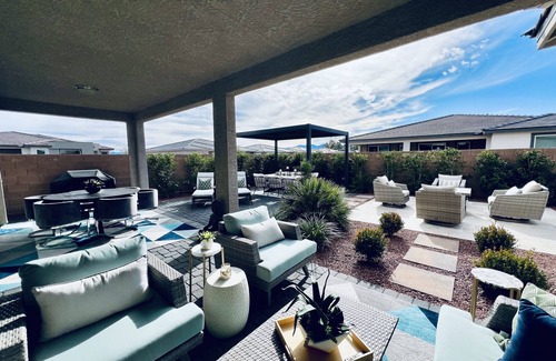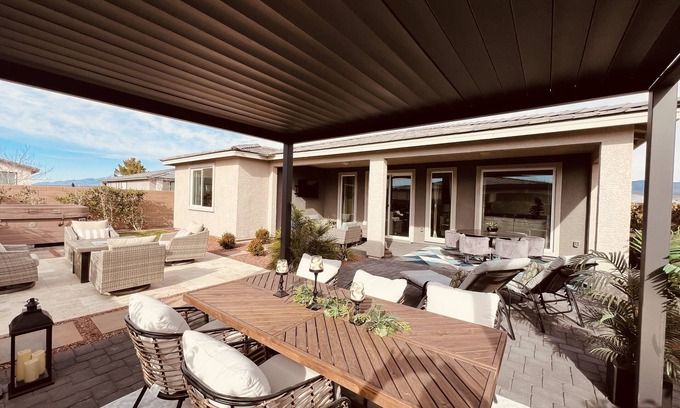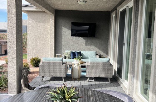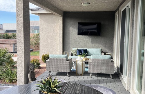 When you stay in this two bedroom two full bath home, you will have plenty of space to enjoy the warm weather that Pahrump brings. enjoy the spacious backyard with the hot tub fireplace, outdoor TV, dining set and living room set all outdoors. The home has been professionally decorated, and is very comfortable.