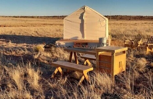 Your stay at Painted Desert Wellness Retreatn promises ultimate comfort and convenience with spacious accommodations. Enjoy a queen-sized bed within a cozy tent equipped with essential amenities such as a propane heater, bathroom facilities, and 360-degree window views. Outdoor features include lounge chairs, a cooking area, and a patio designed for taking in the scenery. With over 1,000 acres to explore, you can take advantage of the natural surroundings for pre-wedding activities or post-ceremony relaxation. The property is also equipped with sound equipment and kitchen facilities, making it an ideal choice for wedding receptions and gatherings.