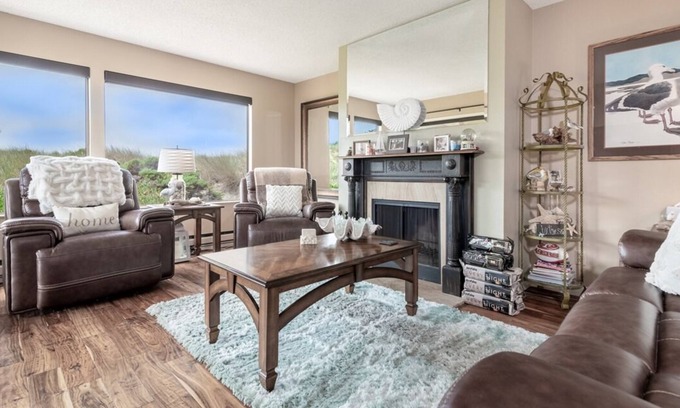 This stylish home features elegant coastal décor, hardwood floors, and exquisite leather seating with electric recliners. The bright and open living room includes an electric fireplace—a cozy touch for relaxing evenings by the beach. The fully equipped kitchen offers everything you need, including a wine fridge, for effortless entertaining.