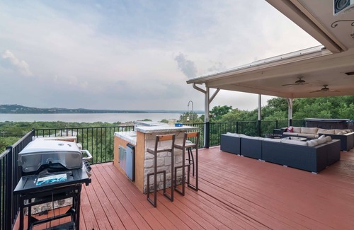 This 4500sqft home nestled on the hillside above stunning Lake Travis is the perfect home for your family (or multi-family) vacation! You’ll have enough room to travel with the entire family or a big group of friends! This house has 5-bedroom, 4 bathrooms, 2 kitchens, 2 levels with spacious decks, a pickleball court, and a swimming pool. Space for everyone.