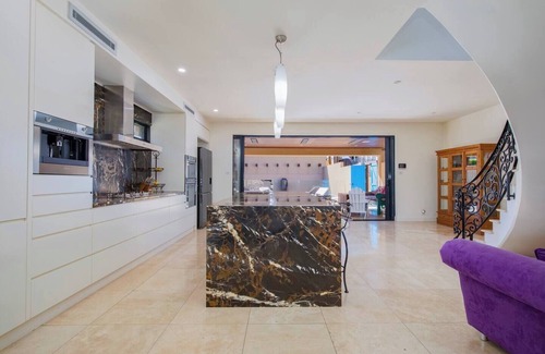 The living and dining area is open plan, with one side opening to a deck and garden, and the other leading out to the pool. A grand oversized kitchen is designed around a central island with plenty of space to socialise, entertain or take things slow at the breakfast bar. Come together for a shared meal in the evening then relax on the lounges for movie nights at home.