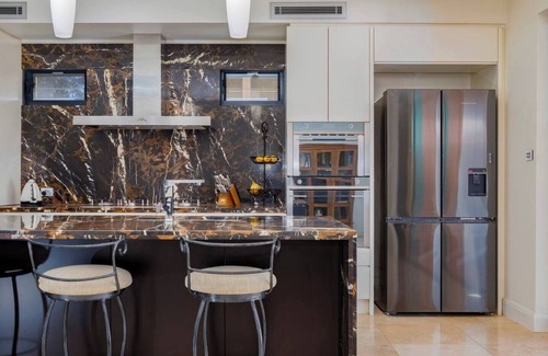 A winding staircase will carry you upstairs to the bedrooms. Each comes with comfortable queen-sized beds and you’ll find storage space throughout for your belongings. Central air-conditioning and heating make this a year-round retreat, while a dedicated office space caters to those combining business and leisure stays. Travelling with kids? A travel cot and highchair can be provided on request. Refresh in two immaculately bathrooms, one with a bathtub, and enjoy the convenience of a laundry room with a washing machine and dryer.