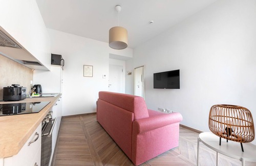 This elegant 1-bedroom apartment of approximately 40 sq m has been furnished with bespoke furniture made by Italian artisans. The apartment opens onto the day area where a comfy double sofa bed (160x200) is located, in front of a 32” Smart TV with WIFI connection which guests can use to access online services - such as Netflix - with their own account. A large balcony is accessible. The kitchen is fully equipped with an electric oven, dishwasher, refrigerator, microwave, toaster, electric kettle and induction hob. The dining table can accommodate up to 4 people. The bedroom is well-lit and furnished with a large wardrobe, a velvet arm-chair and a comfy double bed (160x200). The bathroom is also well finished and equipped with a large crystal shower, heated towel rails and washing machine.