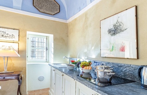 Once past the pedestrian gate, one's eye is captivated by the first level of the splendid garden, with the characteristic square swimming pool in the centre of the lawn set up as a solarium area. Facing it is the attractive yellow tufa-stone façade of the house with, in the background, the old bell tower of the parish church of Sant'Eusebio whose origins date back to the 1600s. Protecting what appears to be the representation of a place where time has magically stopped for centuries is a tall hornbeam hedge that ensures privacy for the property. Adjacent to the lawn-solarium of the swimming pool, twelve steps lead up to the kitchen terrace, arranged with table and chairs for outdoor dining between dips in the pool. Continuing on, another five steps lead up to the second level of the garden where the main entrance to the house is located. Here, among the gravel paths that adorn four large areas of lawn, is the old well which, still today, fulfills the garden's water needs. Roses and jasmine embellish a large pergola, furnished with tables and chairs, adjacent to a lovely veranda with the fully-equipped kitchen connected to one of the double bedrooms. The colours of the hydrangeas and buddleias complete the picture of this beautiful garden. In the corner at the garden entrance are the wood oven and the barbecue, protected by a canopy of reeds.Please notice that photos are taken in spring, therefore flower blossoming, and the colours of the gardens' grass could be different at the moment of your arrival at the villa.