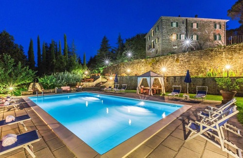 It offers 6 bedrooms, 7 bathrooms, and a private pool. It is a luxurious country home in a wonderful location near the little village of Monterchi (near Arezzo), all surrounded by a wide, private park with a wonderful garden and a pool warmed by an all day sun exposure with an impressive panoramic view.