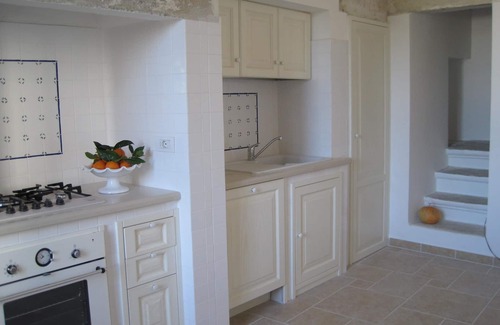 2- attic panoramic view on the castle: 1 double bed and 1 adjoining twin room for a total of 4 beds which feature a large bathroom with shower and corner bath, a kitchen with laundry facilities and a fantastic 'Lamia' (terrace Salento ) overlooking the medieval castle for an unforgettable dinner under the stars.