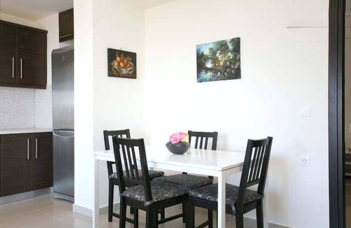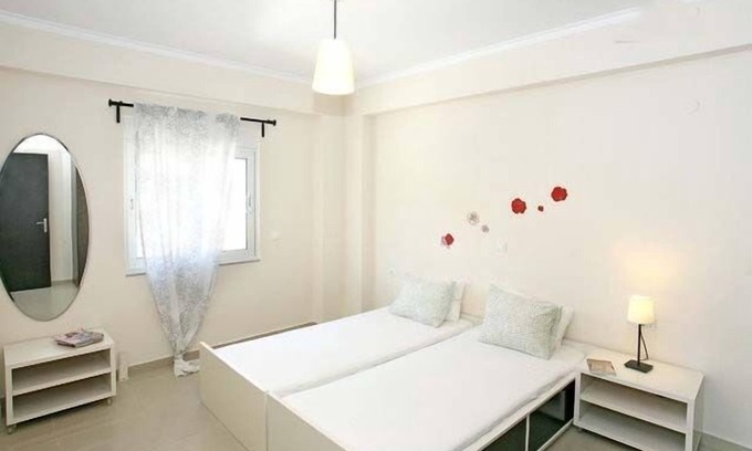 The master bedroom has two single beds. The living area features a single bed-sofa that can be double bed, armchair, coffee table, dining table with four chairs and large flat-screen TV. There is a fully equipped kitchen with refrigerator, oven, cooking utensils where guests can prepare meals, the apartment is air conditioned throughout and has washing machine at the bathroom. As our environmental policy, the hot water comes from the sun all year long and all electronic equipment is energy efficient A++.