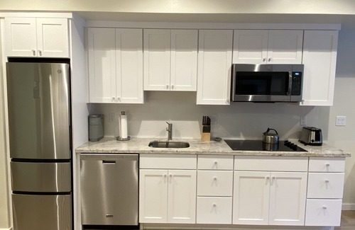 - Modern kitchen appliances include refrigerator/freezer, Keurig coffee station, dishwasher, sink, 4-burner cooktop, and convection/microwave oven