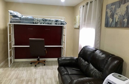 Guest suite - Suite has a private entrance with keypad. Suite has a full size murphy bed that starts as a desk and pulls down. There is a twin size bunk bed on top. Suite has a full bathroom with shower and a closet and dresser drawers for storage. 140 channels of cable tv, super cold AC, mini fridge, microwave, coffee maker, shower essentials included. No formal kitchen in the studio. 2 bicycles are available for an additional per diem fee