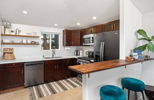 The property features a fully fenced and gated area, ensuring privacy as you prepare for your wedding. Enjoy the spacious patio surrounded by palm trees, ideal for pre-wedding gatherings or intimate ceremonies under the clear skies. In addition, the guest house is equipped with modern amenities, allowing you and your guests to relax and enjoy every moment of your stay. Whether you plan to host small wedding parties or simply need a cozy getaway after the festivities, Palm & Oak provides all the comforts you desire.