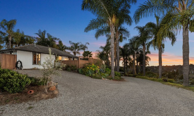 Welcome to Palm & Oak - Detached Guest House - Mountain Views, your perfect retreat for an unforgettable wedding experience. Nestled on a beautiful 4-acre private estate in Fallbrook, California, this guest house boasts stunning mountain views and serene surroundings, providing a romantic backdrop for your special day. With its modern bohemian decor and peaceful atmosphere, it creates an enchanting setting for couples seeking to celebrate their love in a picturesque location.