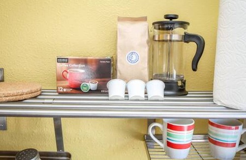 The kitchen is equipped with an oven/stove, microwave, sink, Keurig coffee maker with locally roasted Sorbenots Coffee, and a quaint eating nook for two. Curl up in the brand new queen-sized bed and enjoy a movie on our large smart TV, complete with a YouTube TV subscription. Guests are welcome to log into their own streaming accounts to watch their favorite shows and movies.