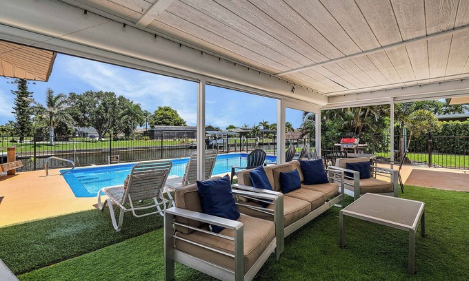 Stay at this luxurious Cape Coral waterfront home with 3 bedrooms, 2 bathrooms, and 2 queen pull-out sofas, sleeping up to 12 guests. Enjoy a heated saltwater pool, private dock for boating, and entertainment options like board games and Bucket Golf. Walking distance to restaurants, bars, and live entertainment. Perfect for family vacations or group getaways. Book your dream Cape Coral vacation today!