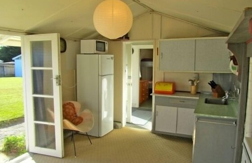 The sleepout is a simple and compact original bach, with open plan living that leads onto the lawn. There is a bedroom just off the kitchen area with 2 sets of single bunks., sleeping four. Main room has full cooking, fridge plus TV/DVD and lounge suite The combined bathroom/shower and toilet complete the sleepout layout.