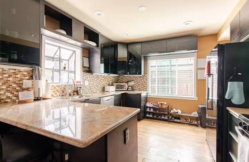 Guests have exclusive access to their private bedroom, each featuring an in-unit kitchenette, full bathroom with shower, and refrigerator. Additionally, guests can enjoy the large, fully equipped kitchen, cozy dining area, and the newly enclosed porch with a comfortable couch on the first floor. A washer and dryer are available for use in the basement. The open backyard is also accessible, providing a perfect space to relax and enjoy the outdoors.
