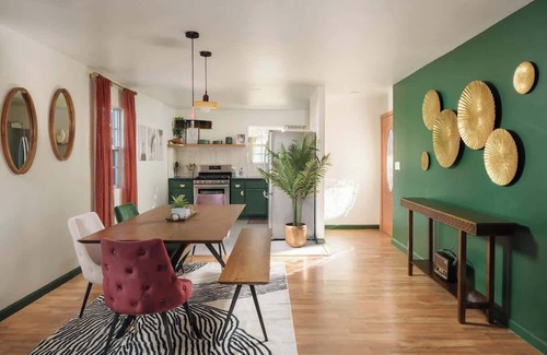 Escape to this luxurious 4-bedroom, 2-bath retreat designed for relaxation and unforgettable memories. The private pool oasis, surrounded by palm trees and glowing string lights, sets the perfect vibe for lounging or evening gatherings. Inside, enjoy uniquely styled bedrooms, spa-inspired bathrooms, and a gourmet kitchen for effortless meals. With vibrant living areas and outdoor entertaining spaces, this home is perfect for families, friends, or work retreats. Book your dream trip today!