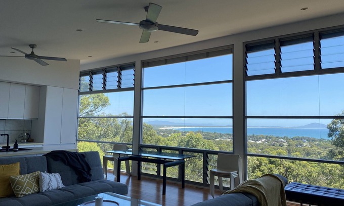 Creatively designed 3 bedroom house with master bedroom wing with ensuite and private deck. There are two other bedrooms both with access to decking with views of the beach and National Park. Open plan living and kitchen where floor to ceiling windows take full advantage of spectacular views.
