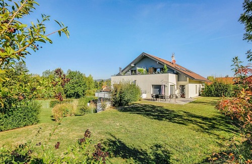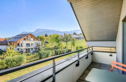 Our flat is located at the superior level of a little hight class villa, you will be amazed by the incredibly calm of the environnement, away from the noisy downtown roads. Bright and crossing, its wooded terrace, South oriented, is a real summer living who will give you a splendid view in the middle of the fields, on the Monts Veyrier and Semnoz, as well as a little insight on the Annecy Lake. Imagine yourself relaxing in a perfect calm, have your breakfast under the sun, in front of the nature, horses and montains... From the balcony of the first room, you will also be able to the magnificent side of Parmelan. You will enjoy the spacious rooms as well, the interior confort and the well-chosen materials : granit, leather armchair, oak floor, XVL furnishings.