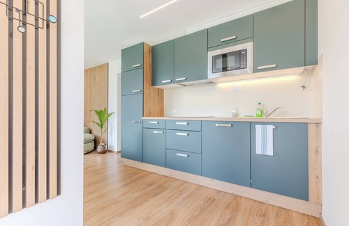 - Apartment 2 on the entrance floor with large corner balcony and mini kitchen.