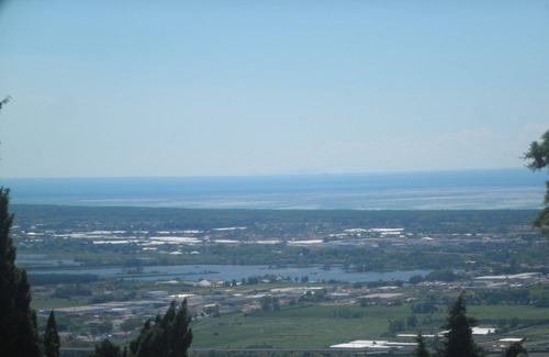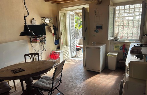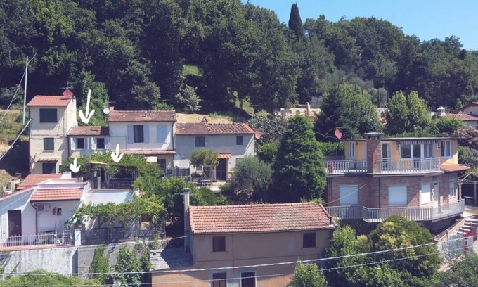 The house is situated on the outskirts of Corsanico next to an olive grove and has a beautiful view of the coast between Livorno and Viareggio. It is very quiet because the road, which also does not pass directly by the houses, has very little traffic. large terrace (approx. 15 sqm) with shady pergola. Between the house and the terrace is also an additional terrace (without panorama but with a lot of shade) with a persimmon tree . The house is typically Tuscan with beams and terracotta floors. The atmosphere in the house is cosy and well equipped but with relatively simple furnishings. (see photos). Inside is fresher in summer because it is an old house. The house is not alone, but in a row of 4 small houses (very nice, quiet neighbours). All around is olive grove and a patch of forest. The road is just below, at the edge of the olive grove.