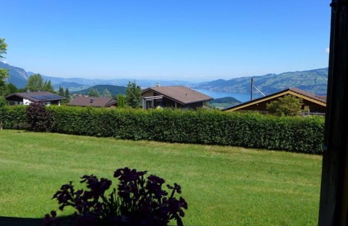 4-room house 120 m2 on 2 levels. Spacious, rustic and tasteful furnishings: living/dining room with panoramic window with dining nook, satellite TV, flat screen, radio, CD-player and tiled stove. Exit to the terrace. Kitchen (oven, dishwasher, 4 ceramic glass hob hotplates, toaster, kettle, microwave, freezer, electric coffee machine) with hatch. On the lower ground floor: 1 small room with 1 bed (90 cm, length 200 cm). Shower/WC. Upper floor: 1 room with 2 beds (90 cm, length 200 cm). 1 small room with 1 x 2 bunk beds (90 cm, length 200 cm). Bath/WC. Electric heating. Large terrace, south-west facing position. Terrace furniture, barbecue, deck chairs (3). Marvellous panoramic view of the lake, the mountains and the countryside. Facilities: washing machine, dryer. Internet (WiFi, free). Parking (2 cars). Please note: suitable for families. Smoke alarm, fire extinguisher.