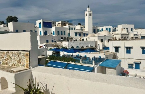 Stay in a charming Arabesque Tunisian house with traditional décor and an en-suite bathroom, located between Ennejma Ezzahra and Dar El Annabi. You'll be steps away from the best of Sidi Bou Said, surrounded by beautiful white and blue buildings and rich local heritage. The rooftop terrace offers breathtaking 360° views of the Mediterranean and the picturesque village, perfect for relaxing and soaking in the timeless charm of this historic gem.