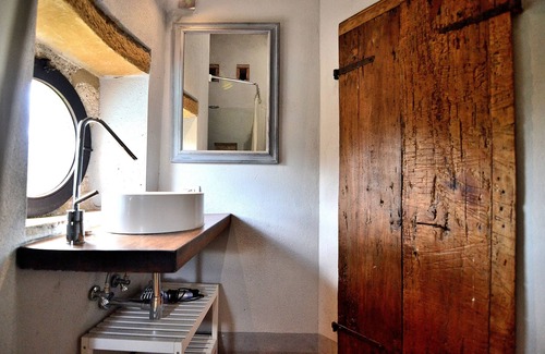 - THE TOWER: The tower is separated from the main block of the castle. However, it is located a few meters from the internal courtyard. The tower is located right next to the pool! Here guests will not find a kitchen. The room with a French bed is located on the ground floor of the tower. Upstairs you will find a bathroom with a shower, toilet and sink. The Torre bathroom has no bidet. Conditioned air. Independent entrance and panoramic view.