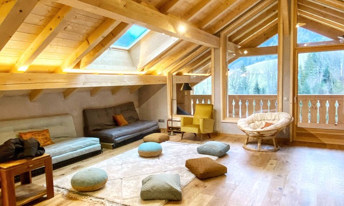 Like a nest perched in front of the Borne valley, the chain of Aravis in the background, our large apartment can accommodate up to 6/8 people.