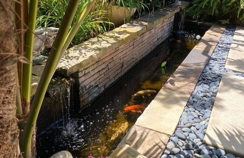 Koi pond with waterfalls in the front makes for a nice area for outdoor yoga