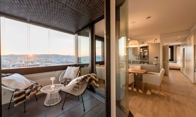 High-end living on 90m2: The top-equipped Panorama Suite can accommodate up to 5 people, it is located on the 11th. Floor overlooking Vienna and is serviced to the highest standards (weekly cleaning and laundry service).