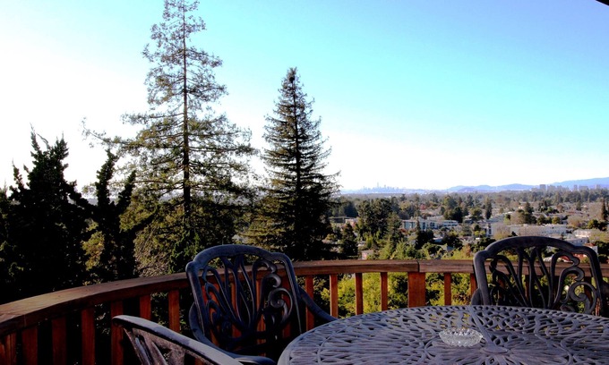 Do you enjoying sitting on a large beautiful deck with comfortable furniture and awesome view of the San Francisco skyline and the famous bridges? The redwood deck is architecturally beautiful with each end shaped into a “Romeo and Juliet” curved balcony. One balcony connects to the master bedroom and has large outdoor Pottery Barn-with-rolled-arms wicker chairs. The other end connects to the kitchen and has a tall, large metal bistro dining table with 4 bar-height cushioned chairs from which to enjoy the view. A grill is on the deck (propane provided).The balconies are connected by a straight portion where there is additional seating.