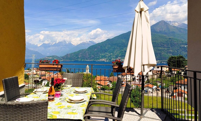 A path between the houses leads from the garage to the large terrace. The front door to the flat is located here. The terrace is furnished with a dining table, sun loungers and a parasol and offers a breathtaking panoramic view of Lake Como and the surrounding mountains.