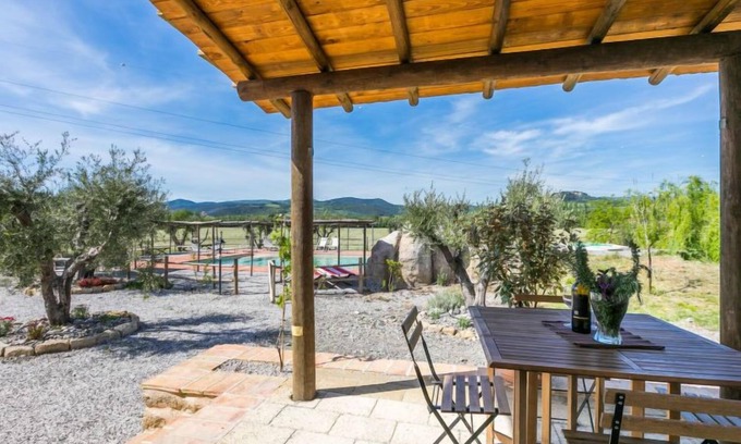 This carefully restored complex is located in the middle of the fields of the Val di Cecina, a few steps from the river of the same name. Much attention was paid to the construction of the swimming pool, where a hydromassage ( about 11 people) and a children's pool carved into the stone were created. Resort "Podere la Querciola", 2 storeys, renovated in 2021, surrounded by meadows and fields. In the district of Casino di Terra 11 km from the centre of Guardistallo, 14 km from the centre of Cecina, in a secluded, quiet position, 16 km from the sea. For shared use: property with plants and trees, swimming pool (6 x 11 m, depth 150 cm, seasonal availability: 01.May. - 15.Oct.). Children's pool, outdoor shower, hot tub, garden furniture, barbecue. In the complex: WiFi, washing machine (extra). Motor access (700 m via unmade road). Parking. Shop 11 km, restaurant 2 km, bar 2 km, bus stop 1.1 km, sandy beach "Marina di Cecina" 16 km. Nearby attractions: Volterra 24 km, Pisa 70 km, Firenze 100 m.