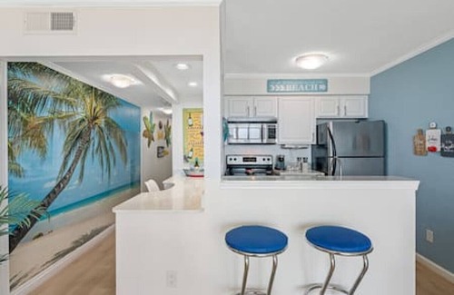 Enjoy breathtaking bay views from this privately owned, fully renovated suite in Tampa. It features a fully equipped kitchen with all the essentials, including a fridge, stove, microwave, and silverware.